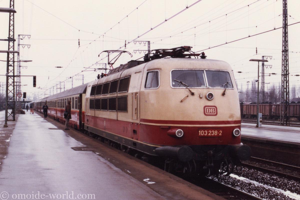 アムステルダム中央駅から待望の「ラインゴルト(Rheingold)」に乗車しました。途中、西ドイツとの国境駅(エメリッヒ駅(Emmerich)ではないかと思います)で西ドイツの103型電気機関車に付け替えるのを見学しました。その後は、列車に乗ってマンハイム中央駅で下車して観光を続けました。