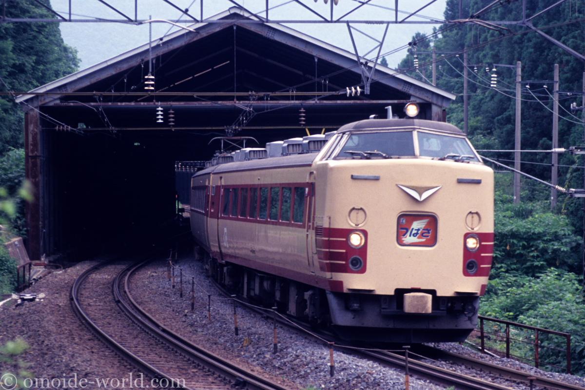 スノーシェッドから出て峠駅の裏手を通過する下り特急「つばさ」485系