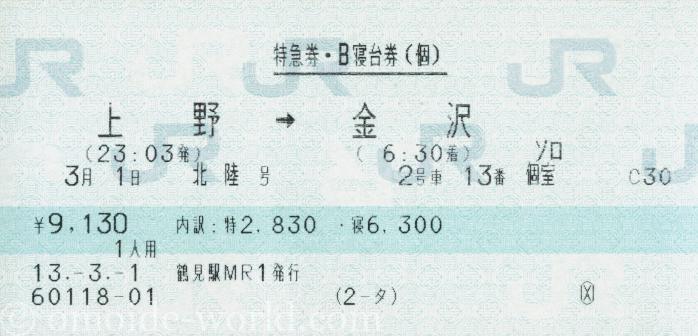 寝台特急「北陸号」の特急券・B寝台券です。上野駅から高岡駅まで乗車しました。