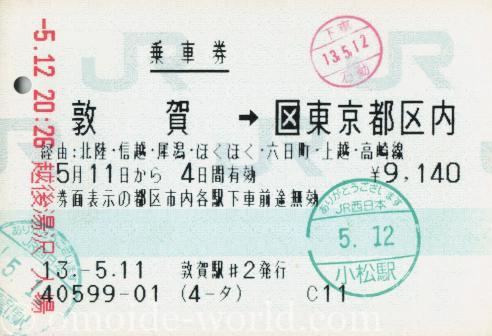 敦賀駅から東京都区内までの乗車券です。
