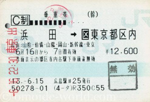 浜田駅から東京都区内までの乗車券です。